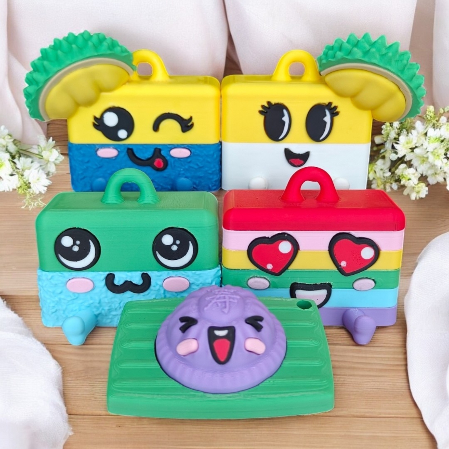 Meet the Kueharmony Keychain Charms Family—Winky Duri (Durian Salat) | Cutie Cassy (Durian Custard Cassava) | Pandan Puffy (Pandan Salat) | Lapi Luv (Pastel Rainbow Lapis) | Chubby Mung Bean (Purple Sweet Potato AKK) and many more! Adorable 3D printed keychains created by Kueharmony, this series reimagines our traditional snacks as “kawaii” collectible toy charms. The perfect way to carry your heritage with a smile. Durable, colorful, and perfect for children!